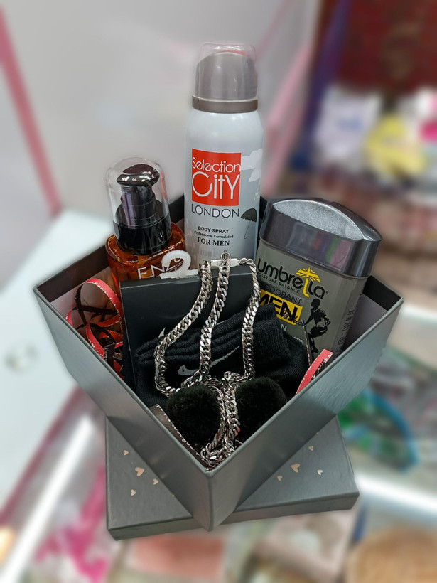 پک هدیه ولنتاین مردانه تم طوسی با ارسال کاملا رایگان پک دارای ۵ آیتم میباشید